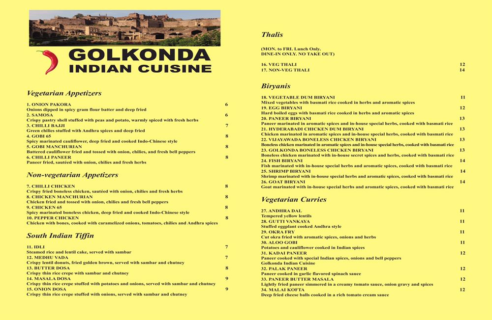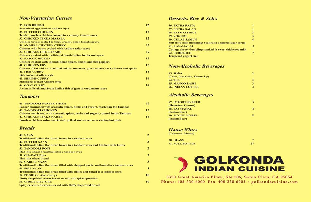 Golkonda Indian offers a wide range of Indian dishes in Santa Clara. With a focus on authenticity and flavor, customers rave about the biryani, chili chicken, and Andhra chicken curry. The restaurant provides a casual and quiet ambiance, perfect for a delicious meal. Vegetarian options are plentiful, catering to all dietary preferences. The staff is attentive and ensures a pleasant dining experience. Customers appreciate the fast service and simple yet inviting atmosphere. Many patrons return for the tasty food and excellent service. If you're in the mood for flavorful Indian cuisine, Golkonda Indian is a must-visit spot in the Bay Area.